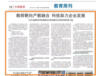2023年3月1日《天津日报》头条以《教师靶向产教融合 科技助力企业发展》为题对我院轨道专业群立足专业优势,通过产教融合、科研开发、企业科技特派员等方式,不断升级、改革教学方式和教学手段,实现校企优势互补,充分发挥学院教师科技支撑作用,推动了校企联合培养的深度合作进行了宣传报道,起到了良好的社会影响。