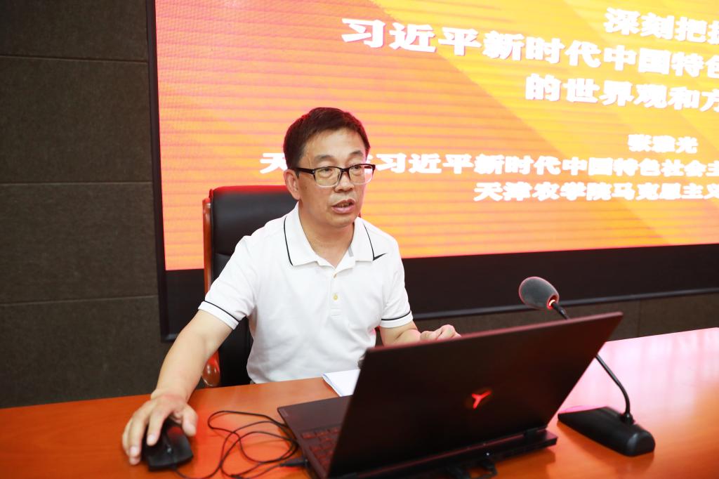 本次辅导讲座邀请天津市委讲师团专家学者宣讲员、天津市习近平新时代中国特色社会主义思想讲师团宣讲成员、天津农学院马克思主义学院张雅光教授进行授课。张教授以《深刻把握习近平新时代中国特色社会主义思想的世界观和方法论》为题,从习近平新时代中国特色社会主义思想的世界观和方法论的逻辑理路、丰富内涵和实践要求三方面系统全面的对习近平新时代中国特色社会主义思想的世界观和方法论进行了深入解读。