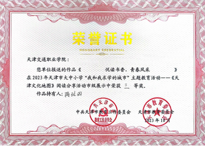 2023年10月26日,2023年天津市大中小学“我和我求学的城市”主题教育活动——《天津文化地图》阅读分享活动市级展示活动在天津外国语大学举行,我院路桥工程学院蒋玲昀、刘硕两名同学以82.6分和82分的优异成绩荣获三等奖。